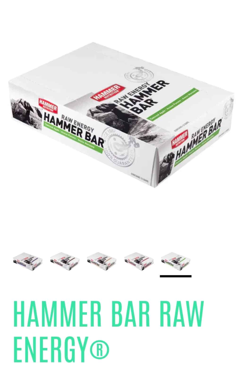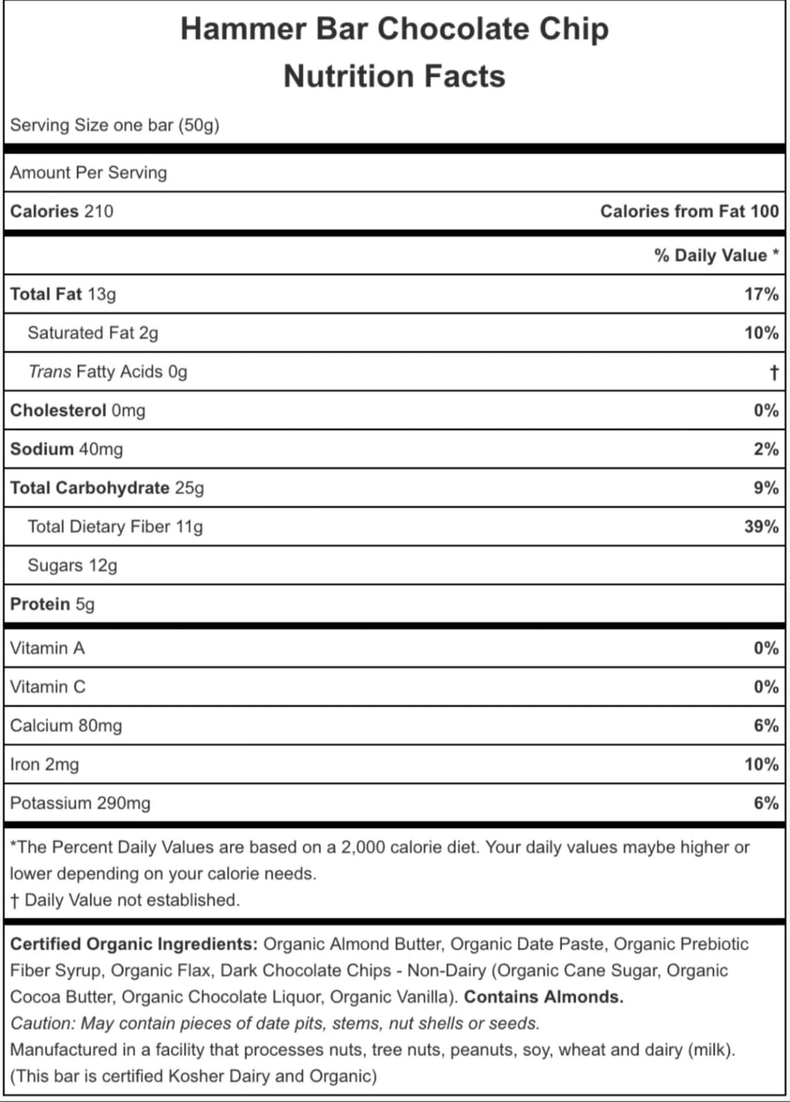 Dependiendo del sabor, cada Hammer Bar contiene entre 182-230 calorías, 25-27 gramos de carbohidratos (ninguno de azúcar refinada), 4-10 gramos de proteínas y 7-11 gramos de grasas saludables. Cuando se desea una elección de alimentos sólidos, Hammer Bar satisface su hambre de manera ideal, sin exceso de calorías vacías. Después de los entrenamientos o las carreras, si se desea una comida sólida, o cuando el uso de Recoverite no es práctico, Hammer Bar es una excelente comida para después del entrenamiento / carrera, que proporciona carbohidratos y proteínas de alta calidad en una proporción ideal de 3:1.