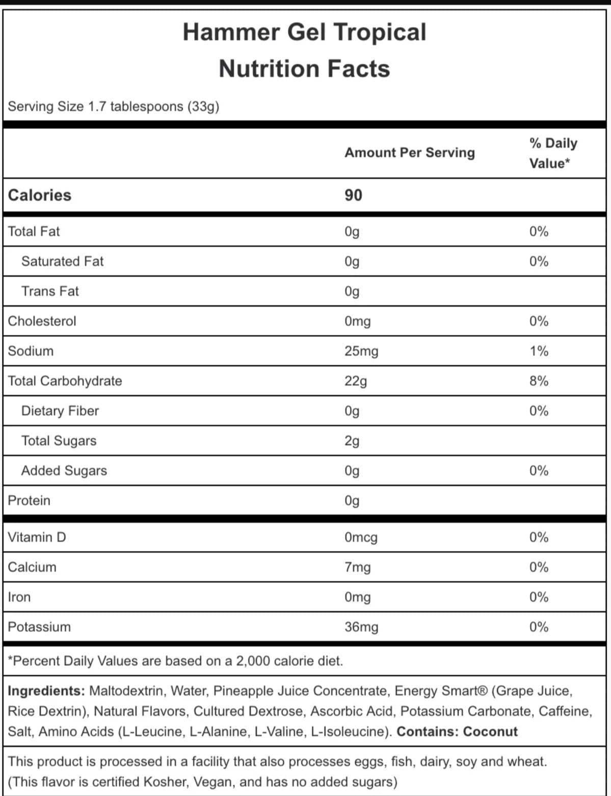 - Hammer Gel puede parecerse a productos similares en el mercado, pero lo que está adentro es lo que cuenta. Otros geles energéticos están hechos con azúcares simples, ácido cítrico y usualmente con sabores y colores artificiales. Los resultados son predecibles: picos o bajones de energía y viajes al baño. Los carbohidratos complejos de Hammer Gel, ingredientes totalmente naturales, y su fórmula para equilibrar el pH te brindan energía rápida pero sostenida en una forma conveniente, sabrosa y concentrada. La adición de aminoácidos de cadena ramificada ayuda a prevenir la degradación del tejido muscular al tiempo que reduce la fatiga. El resultado es una fuente de combustible concentrado altamente eficaz que se digiere más fácilmente que cualquier otro gel energético. Puede parecer similar a los demás, pero los ingredientes y los beneficios son completamente distintos. Hammer Gel es un verdadero combustible de resistencia, ¡no azúcar! Solo los sabores Espresso y Tropical contienen cafeína, 50 mg para Espresso y 25 mg para Tropical por porción.Utiliza Hammer Gel como tu fuente primaria de caloría durante ejercicios y competencias de duración de 2 hrs
