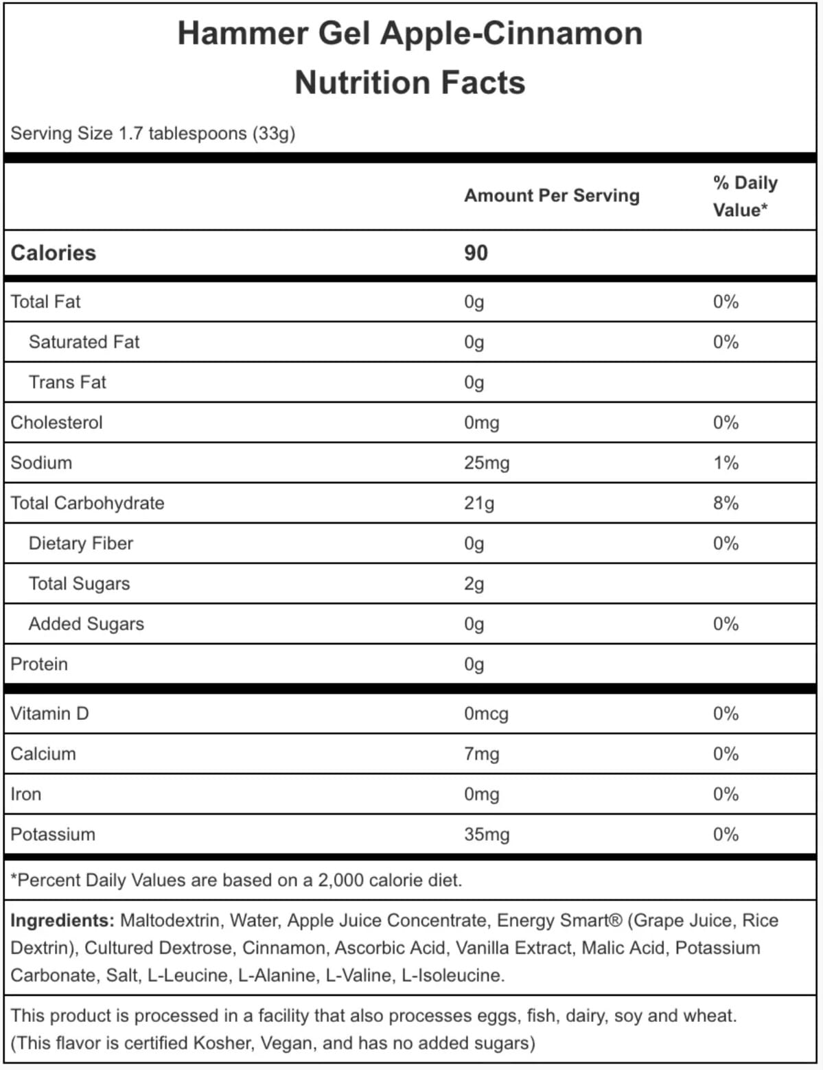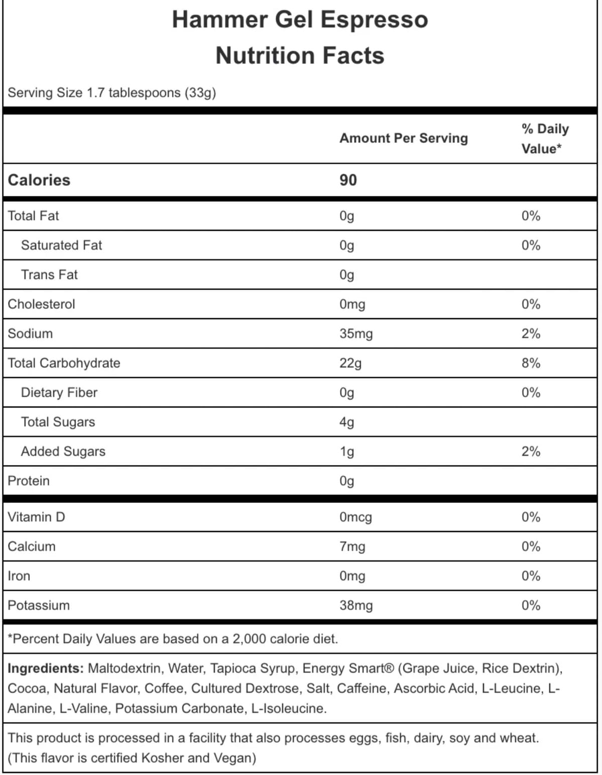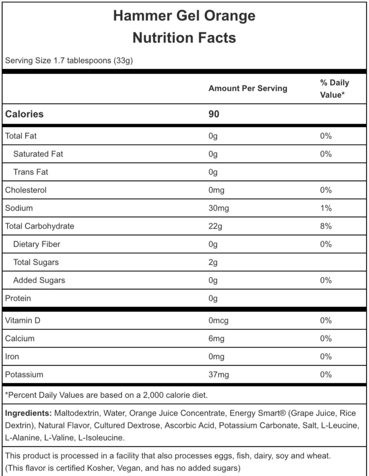 Energy Smart® (jugo de uva, dextrina de arroz): este edulcorante completamente natural y bajo en azúcar juega un papel importante en el delicioso sabor de Hammer Gel al tiempo que contribuye mínimamente al contenido general de carbohidratos. Energy Smart® está certificado como no OGM, sin gluten y alérgeno.