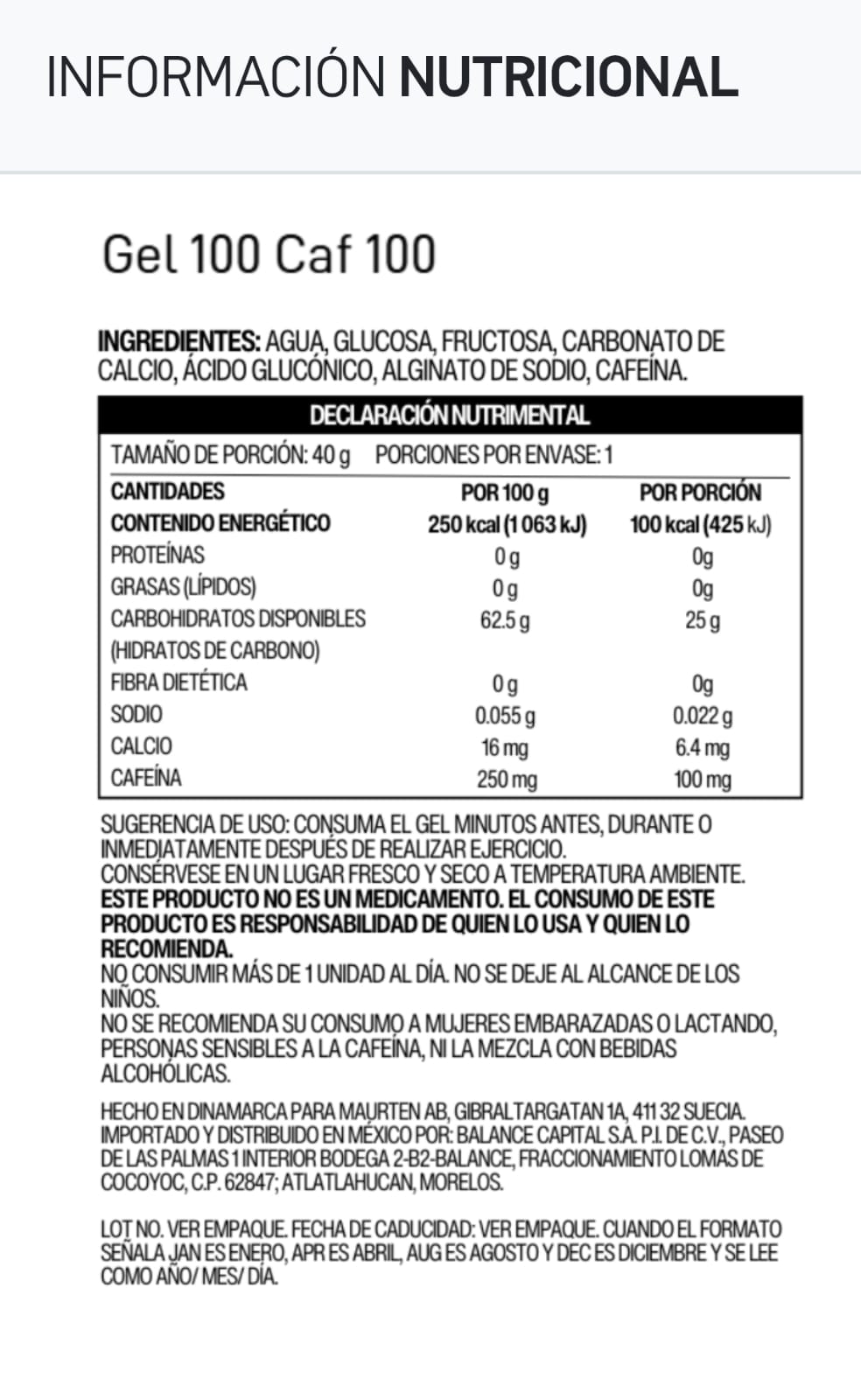 Gel 100 Caf 100 contiene 100 mg de cafeína, que equivale a 1.5 expresos o una taza de café preparado. Ofrece 25 gramos de carbohidratos a través de una combinación única de fructosa y glucosa (proporción de 0.8:1), esta permite la absorción de hasta 100 gramos de carbohidratos por hora.
